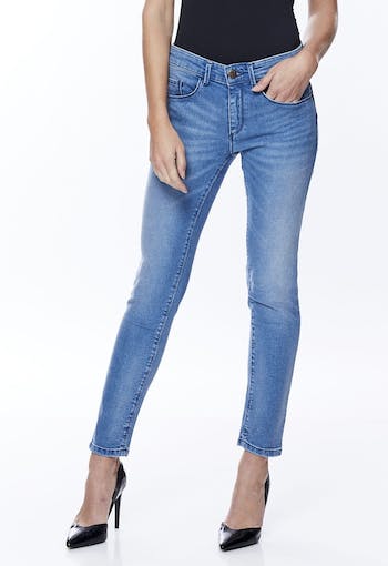 5-pocket jeans, slim fit, Push Up effect , rounded rise, ultra-stretch stone-brushed sculpting denim, cotton 88% elastomultiester 4% elastane 8%. Inseam length: 72 cm for size 38. The model is wearing a size 38.